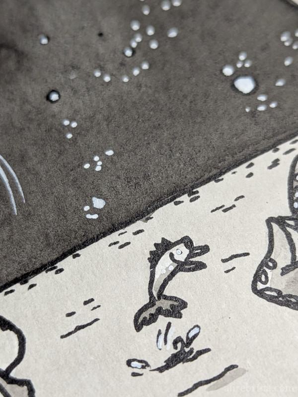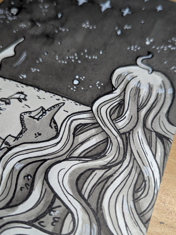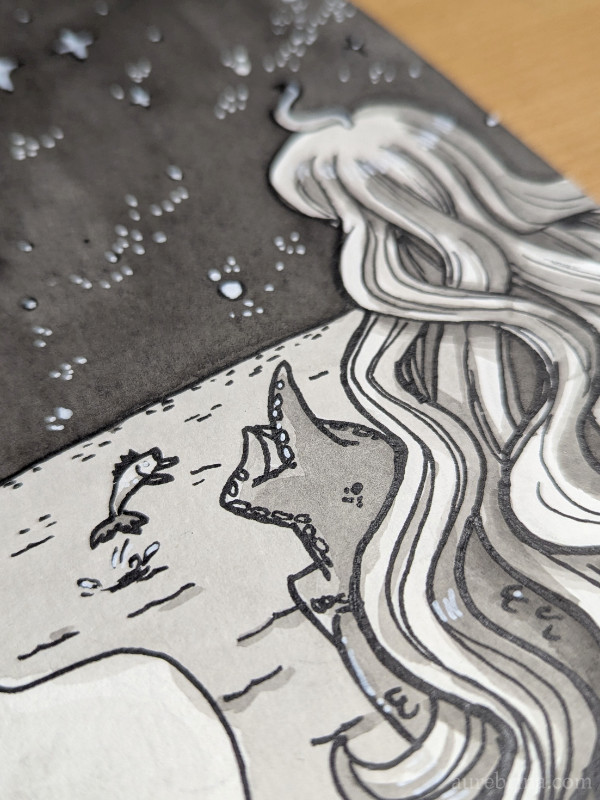 Nous voilà enfin arrivé au dernier jour du challenge. Et je vous dévoile le dernier dessin du challenge et le dernier dessin de cette aventure fantomatique. On est enfin sorti du monde sous-marin, du moins on est revenu à la surface. Et le cerf est retourné là où il devait… la couronne aussi. Tout est rentré dans l’ordre.